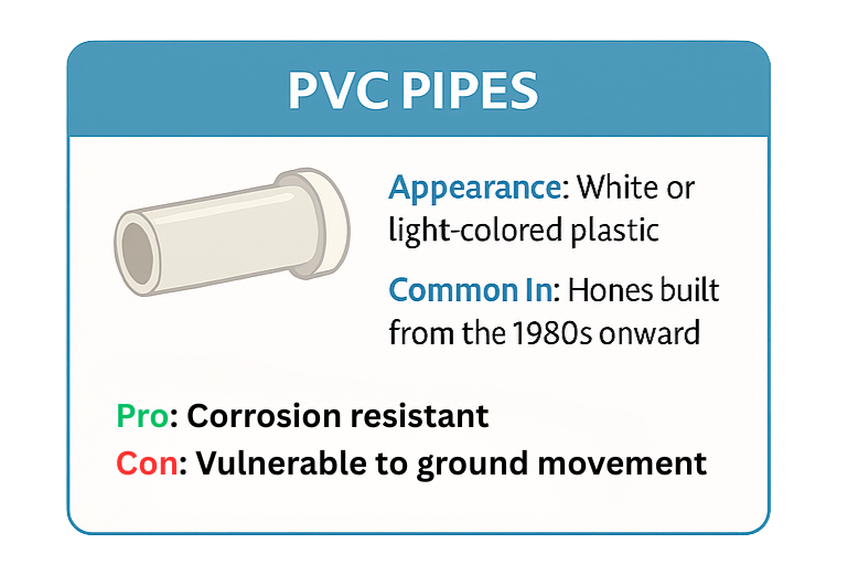 • PVC & ABS Pipes: Avoid harsh chemical drain cleaners and inspect after ground movement.