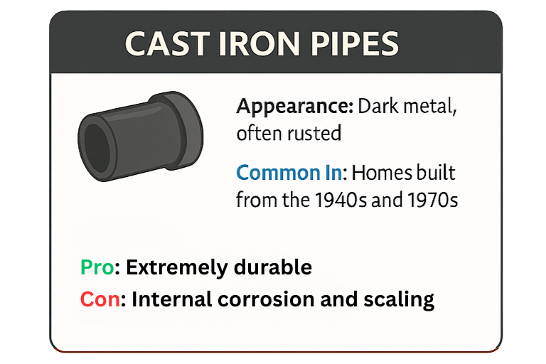 Exposed piping in basements, crawl spaces, or near cleanouts may provide visual clues based on color and texture.