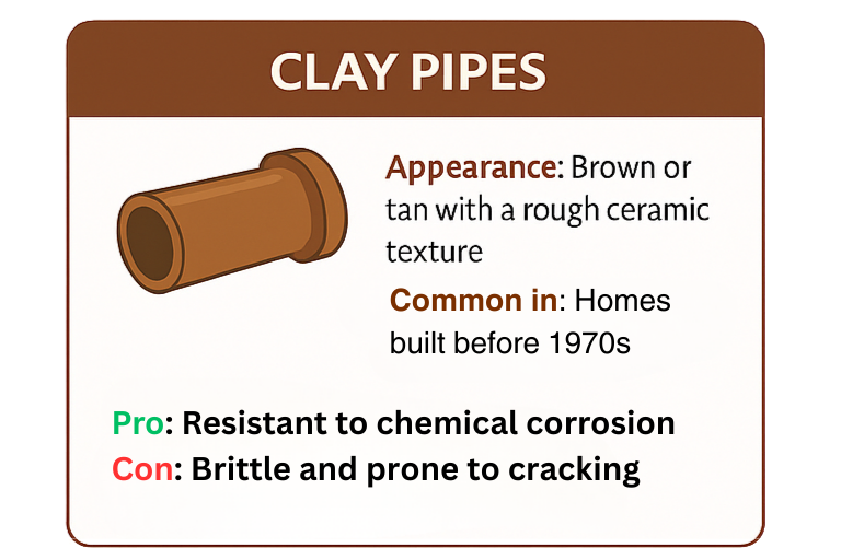 Homes built before the 1970s commonly contain clay or cast iron sewer lines, while newer homes typically use PVC or ABS.